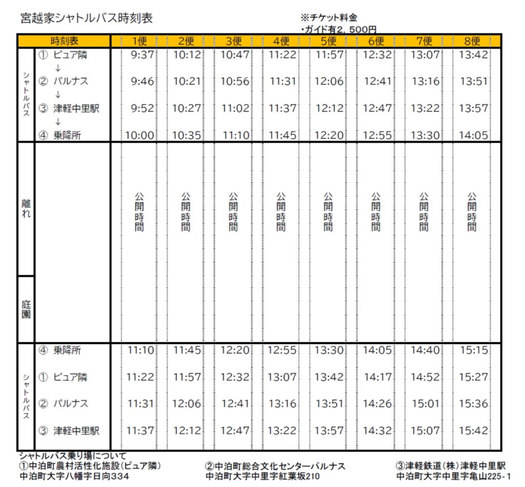 - トイレは宮越家シャトルバス乗り場にあるトイレをご利用ください。