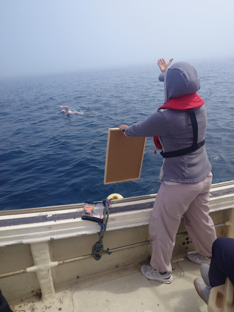 オブザーバーとして同じ時間を過ごす中で、濃霧や潮流によって不安になる瞬間もありましたが、潮の流れが変わり、スイマーが陸に向かって確実に進み始めたときには、胸の奥から安堵と感動が込み上げてきました。