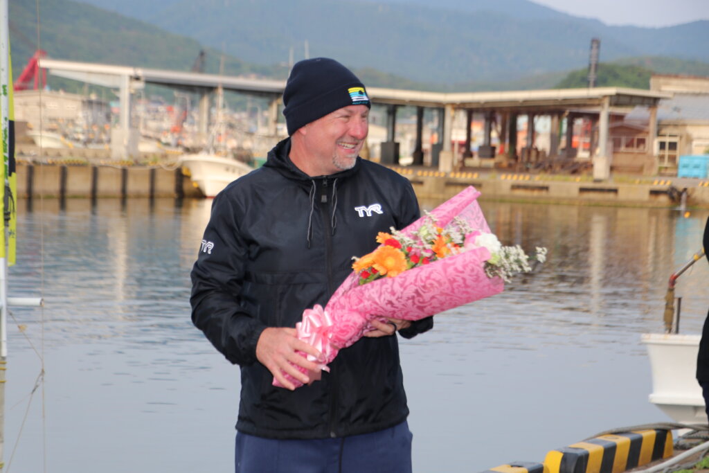The sea stayed calm for most of the swim, and the weather was kind to us. The first half went smoothly — for a while, it even seemed he might finish with ease. But after the halfway point, a thick fog rolled in, and in the area where the current was strongest, his progress slowed to a crawl. There were tense moments, yet he stayed calm and responded cheerfully to the team’s encouragement. Watching him persevere and finally reach the finish was deeply moving. After the swim, Mr. Leitch was clearly shivering from the cold, but thanks to the team’s care, he soon recovered and looked lively again by the time we returned to the harbour. I had worried I might get seasick, but instead, I found myself enjoying the experience — and the stunning scenery of the Tsugaru Strait. It was an unforgettable day, and I’m grateful to have witnessed such a remarkable challenge. I look forward to seeing more incredible swims in the future. Congratulations once again, Mr. Leitch!